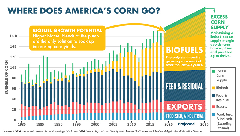As the domestic market for corn from the biofuels industry grew, it soaked up enough surplus grain from 2000 to 2013 to balance the commodity markets and help make agriculture profitable. Unfortunately, since the biofuels market stopped growing in 2013, yields have continued to rise, values have declined and farm incomes have been cut in half.